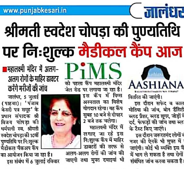 श्रीमती स्वदेश चोपड़ा की पुण्यतिथि पर निःशुल्क मेडिकल कैम्प आज